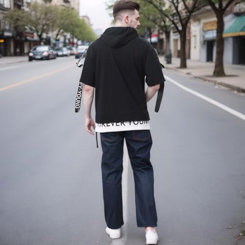 Mens Short Sleeve Hoodie Patchwork T-Shirt Pocket Hip Hop Athletic Hoodie Casual 1
