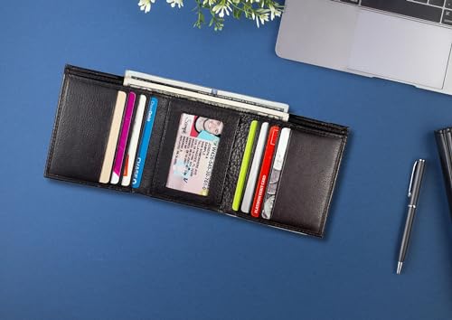 • RFID SECURITY: Our trifold mens wallets are equipped with advanced RFID SECURE Technology, a unique aluminium metal composite, engineered specifically to block RFID signal from electronic pick pocketing of your credit card or ID card data.