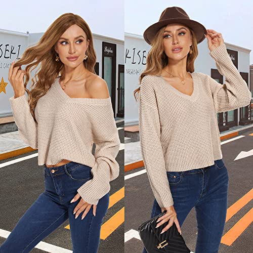 Jumppmile Womens V Neck Waffle Knit Cropped Top Long Sleeve Pullover Crop Sweater 6
