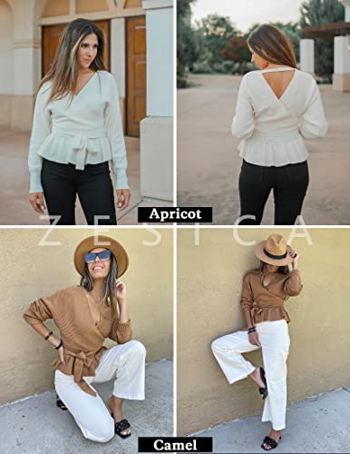 HOT ! ZESICA Women's Fall 2025 Wrap V Neck Long Batwing Sleeve Belted Waist Ruffle Knitted Sweater Pullover Top
