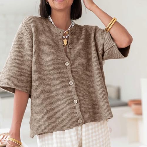 HOT ! Women's Lightweight Button Up Knit Cardigan Short Sleeve Round Neck Solid Color Y2k Sweater Knitwear Tops