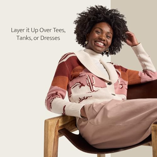HOT ! Pendleton Women’s Western Scenic Cardigan - 100% Cotton Knit Sweater Jacket, Ribbed Collar, Washable - Brick/Rose Multi