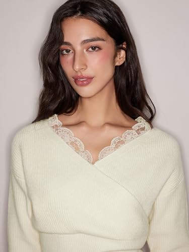 CIDER Wrap Sweater for Women V Neck Long Sleeve Knit Top Solid Lace Trim Pullover Oversized Sweaters 7