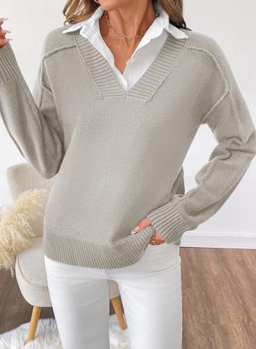SHEWIN Womens Long Sleeve V Neck Sweaters Casual Loose Drop Shoulder Solid Knit Pullover Sweater Tops 6