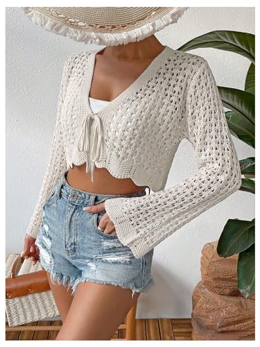 GORGLITTER Women's Crochet Tie Front Tops Bell Long Sleeve Cropped Cardigan Summer Beach Festival Boho Tops 2025 2
