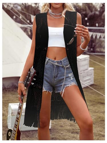 HOT ! MakeMeChic Women's Fringe Vest Sleeveless Crochet Open Front Vintage Western Sweaters Cowboy Cardigan