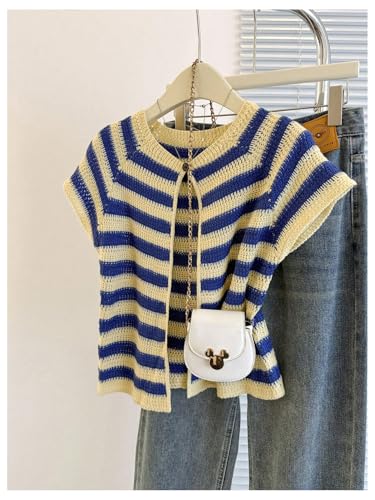 • Feature: Striped Pattern, Button Front, Round Neck, Cap Sleeve, Open Front, Rib Knit, Cardigan Sweaters for Women