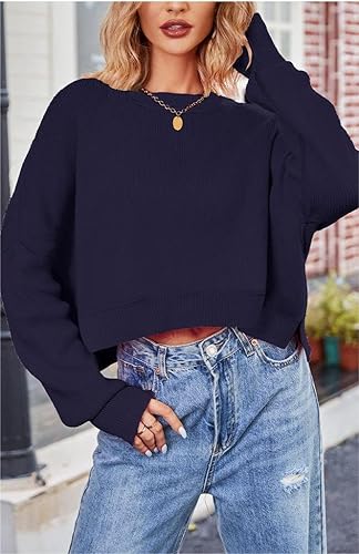 More information about Women's Crewneck Cropped Sweater Fall Ribbed Knit Pullover Jumper Tops (Navy Blue,Medium)