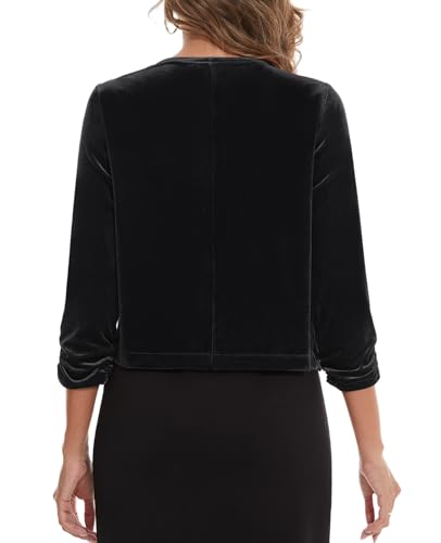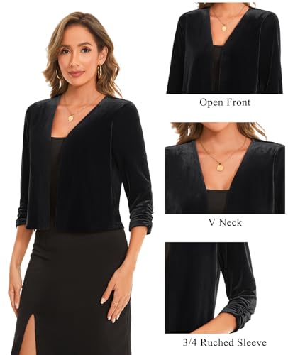MINTLIMIT Women's Velvet Shrug Cropped Cardigan Ruched 3/4 Sleeve Open Front Cocktail Party Bolero Shrug Top for Dress 3