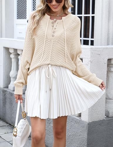 Women Oversized Knit Sweatshirt Hollow Long Sleeve Button Drawstring V Neck Pullover Sweaters 6
