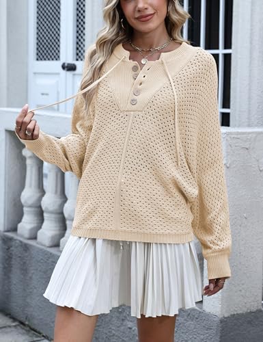Women Oversized Knit Sweatshirt Hollow Long Sleeve Button Drawstring V Neck Pullover Sweaters 5