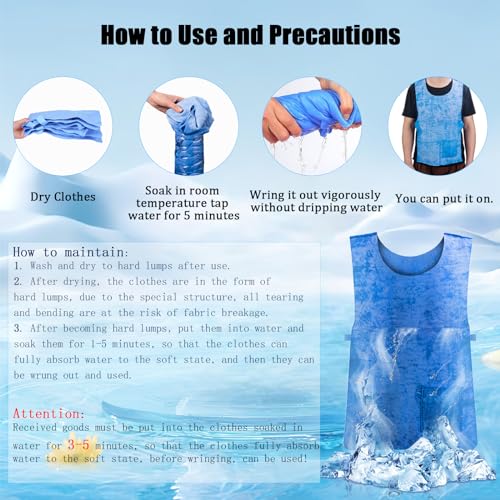 • How to Use - Soak the ice vest cooling in ordinary tap water or cold water for 5 minutes to make the fabric absorb water fully. Wring it heavily without water drops, then you can wear it, cool down quickly. Enjoy instant cooling relief and comfort from the heat for hours.
