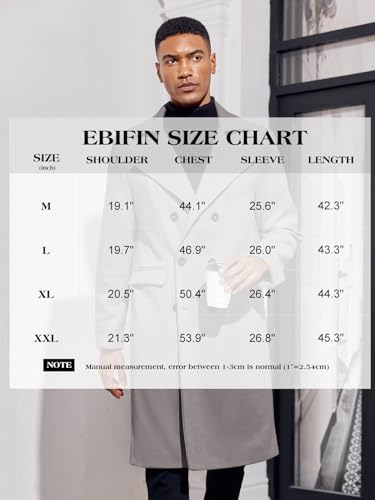 Ebifin Men's Notch Lapel Double Breasted Long Trench Coat Casual Cotton Blend Peacoat 5