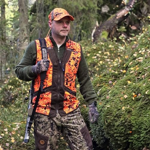 • The Atenze Vest in camouflage orange is ideal for hunting. Its special camouflage pattern blurs the silhouette and integrates it into the environment. The striking orange color ensures that the hunter remains highly visible without compromising his safety. It meets the requirements of various hunting styles. The faux suede details give the vest a classic hunting look.