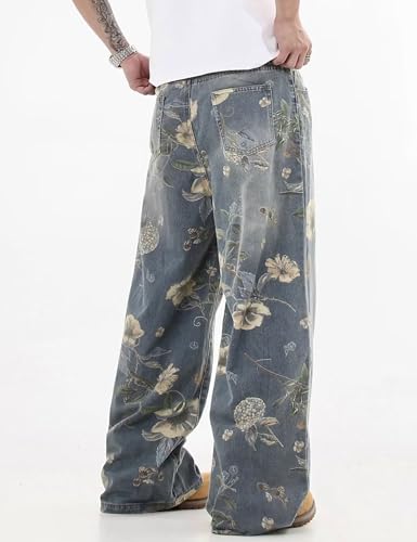 HOT ! Y2k Baggy Jeans Men Flower Print Graphic Jeans Harajuku Wide Leg Boyfriend Denim Pants Streetwear