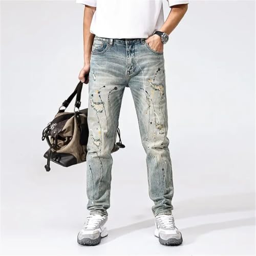 Men's Slim Straight Jeans Retro Do Old Washed Splash Ink American Style Hole Small Leg Trousers 1