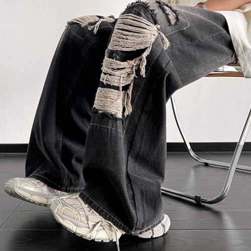 HOT ! Ripped Baggy Jeans for Men Distressed Y2K Style Wide Leg Denim Pants Grunge Streetwear Fashion Black