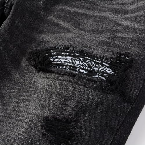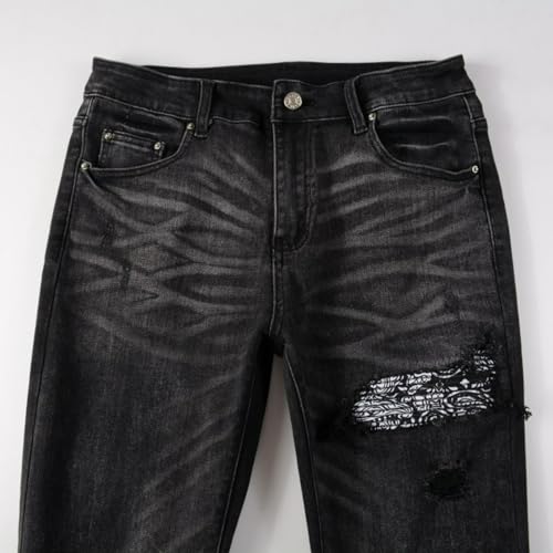 Jeans Pants Trousers Denim Street Trendy Wrinkle Cashew Blossom Hole Elastic Tight Fit Small Leg for Men 6