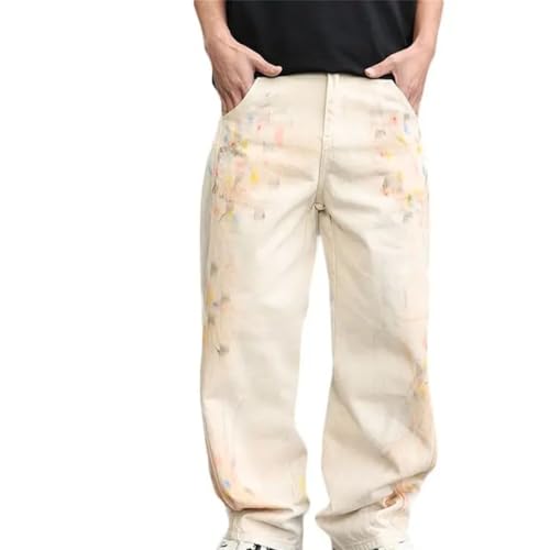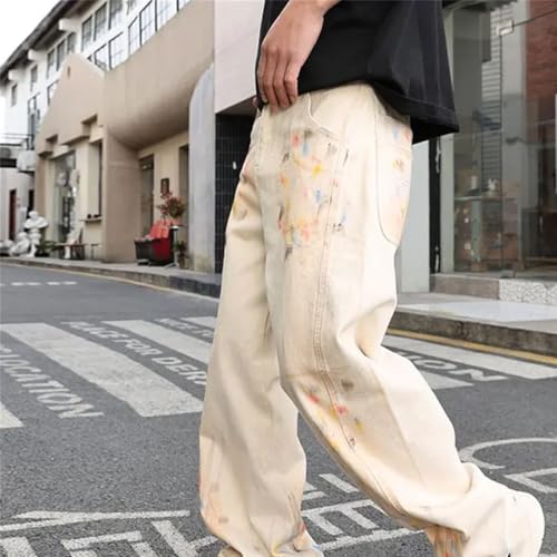 HOT ! Men’S Y2K Painted Oversized Loose Fit Straight Denim Pants Zipper Fly Midweight Full Length Pockets Jeans