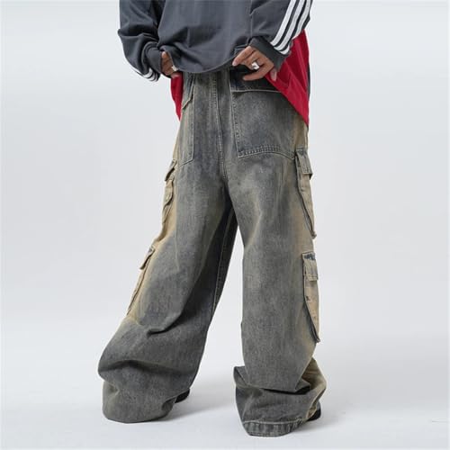 Men Street Wornout Workwear Multiple Pockets Jeans Casual Straight Leg Floor Pants Trousers Loose 4