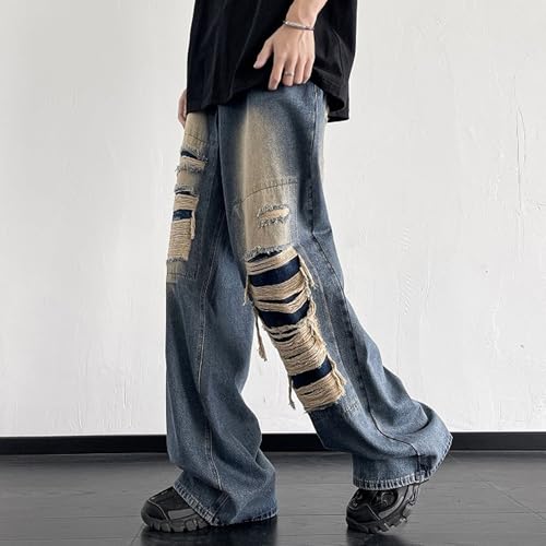 More information about Vintage Ripped Jeans Men's Wide-Leg Straight Cargo Jeans Distressed Hip-Hop Trousers with Pockets