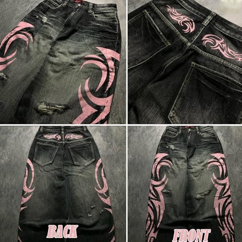 • Millennium Gothic Street Mix and Match:Combining mysterious totem prints with loose cuts to recreate Y2K retro futuristic aesthetics.Retro pink totem print graphic,wide leg,distressed,hip hop pants,y2k streetwear style,causal trendy grunge jeans for teen boys and girls.