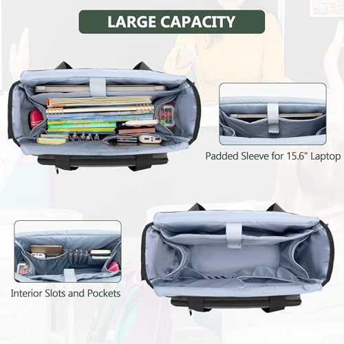 • ROLLING TEACHER BAG: DIMENSIONS - L16.1" * W9.3" * H14.4". Rolling teacher tote with 2 padded sleeves for file folder, iPad or laptop (up to 15.6"). Large capacity main compartment for carrying teacher essentials, like binders, research paper. 2 interior side pockets for teacher cosmetics, water bottles, umbrellas, etc.