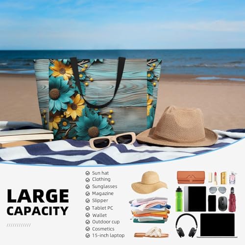HOT ! Sunflower Teal Beach Bag Vintage Wooden Board Pool Bag for Women Waterproof Large Travel Tote with Zipper Organizer for Swimming Vacation Essentials