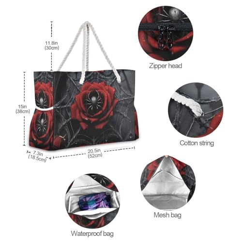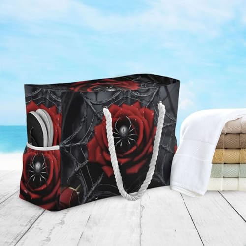 HOT ! Large Tote Bag for Travel Beach Pool Gym-Red Rose Web Gothic Print with Waterproof Pocket Shoulder Bag 20.5 X 7.3 X 15 inch