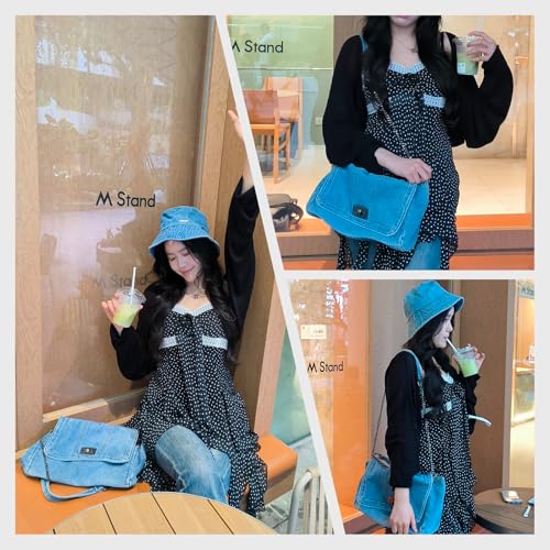 2PCS Denim Tote Bag and Denim Cap Set for Women, Retro Washed Shoulder Handbag Crossbody Purse with Adjustable Chain 5