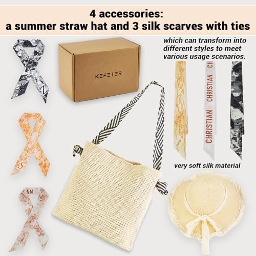 • 【Unique Fashion Details】 The navy geometric - patterned strap creates a modern contrast against the cream - colored body, adding a trendy touch. Plus, with 3 decorative scarves and 1 sun hat included, you have multiple styling options to express your personal style and stand out from the crowd.