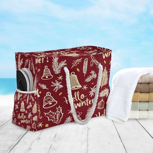 HOT ! Large Beach Bags Totes Canvas Tote Shoulder Bag Red Christmas Elements Water Resistant Bags for Gym Travel Daily
