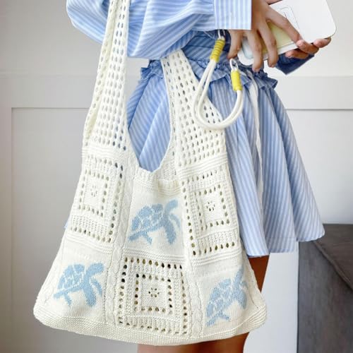 Beach Bags for Women, Woven Bags for Women, Travel Knitted Pack, Turtle Pattern, Seaside Hollow Woven Style, Beige 5