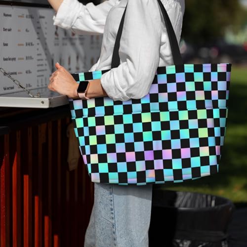 Large Beach Bags for Women Sandproof - Iridescent Checker Print Summer Work Travel Tote Bags with Zipper 6
