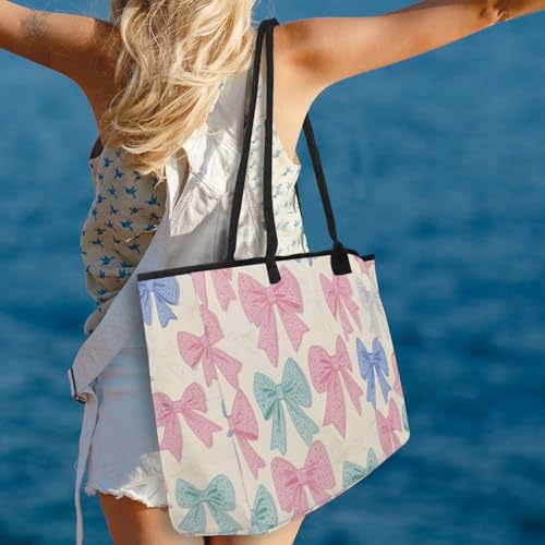 Large Beach Bag for Women, Bows Colorful Pattern Travel Tote with Pockets Waterproof Shoulder Handbag 3