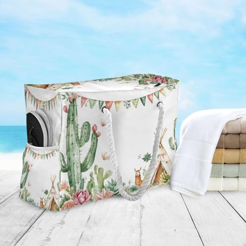 HOT ! Cute Llama and Cactus Beach Bag & Travel Tote Bag Large Sandproof with Zipper Closure, Wet Pouch for Swim Gym Travel, Lightweight Foldable Outdoor Bag