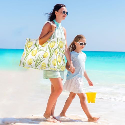 HOT ! Yellow Tulips Beach Bag & Travel Tote Bag Large Sandproof with Zipper Closure, Wet Pouch for Swim Gym Travel, Lightweight Foldable Outdoor Bag