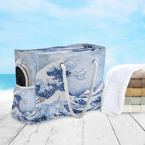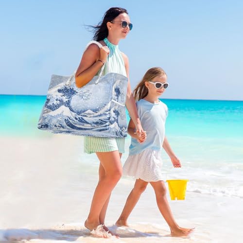 HOT ! Sea Waves Beach Bag & Travel Tote Bag Large Sandproof with Zipper Closure, Wet Pouch for Swim Gym Travel, Lightweight Foldable Outdoor Bag