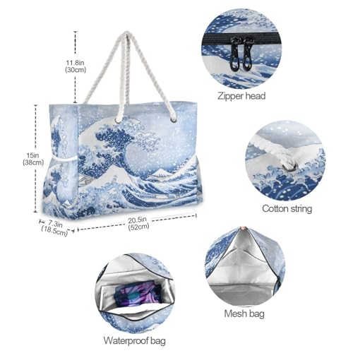 Sea Waves Beach Bag & Travel Tote Bag Large Sandproof with Zipper Closure, Wet Pouch for Swim Gym Travel, Lightweight Foldable Outdoor Bag 7