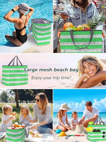 HOT ! Beach Bags Women Mesh Tote Bag Modern Green White Stripe Toy Grocery Pool Bag with Pockets for Travel/Picnic/Shower