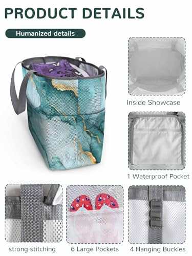 Mesh Beach Bag Oversized Tote Bags for Women Teal Marble Gold Foil Large Travel Pool Bags with 8 Pockets 7