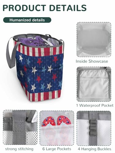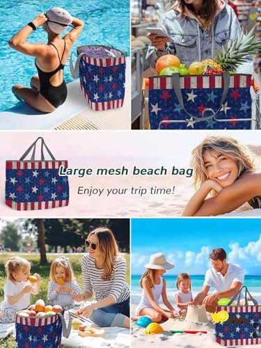 • 60L HUGE STORAGE: 24"L x 15.7"H x 9"W oversized mesh beach bag for women and men. The beach tote bag has 7 mesh pockets and 1 inner waterproof zippered pocket. Holds 4-6 beach towels, swimsuit, flip flop, sunglasses, camera, water bottle, toy, sunscreen and everything family beach travel need; put items where you want and stand upright land. And Inside the beach tote bag is a splash-proof zippered pocket to keep your valuables and electronics dry. Patriotic Pentagrams