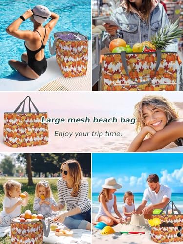 HOT ! Mesh Beach Bag Oversized Tote Bags for Women Thanksgiving Pumpkin Fall Orange Maple Leaf Large Travel Pool Bags