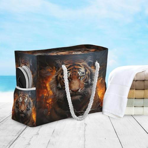HOT ! Flaming Tiger Beach Bag & Travel Tote Bag Large Sandproof with Zipper Closure, Wet Pouch for Swim Gym Travel, Lightweight Foldable Outdoor Bag