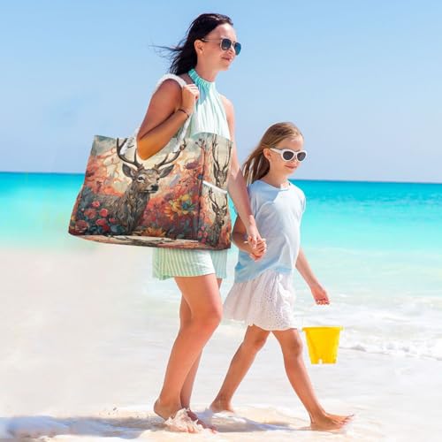 Beautiful Deer and Flower Beach Bag & Travel Tote Bag Large Sandproof with Zipper Closure, Wet Pouch for Swim Gym Travel, Lightweight Foldable Outdoor Bag 1