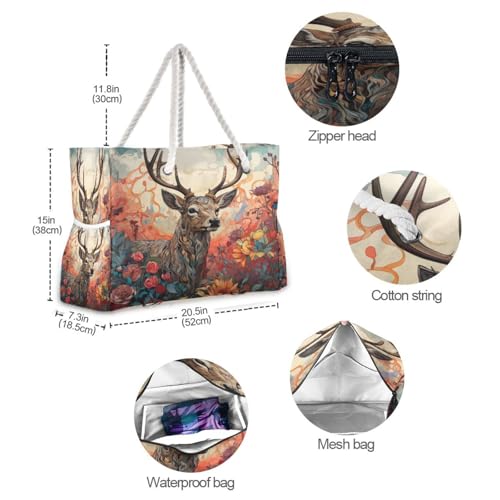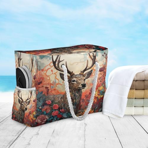 HOT ! Beautiful Deer and Flower Beach Bag & Travel Tote Bag Large Sandproof with Zipper Closure, Wet Pouch for Swim Gym Travel, Lightweight Foldable Outdoor Bag