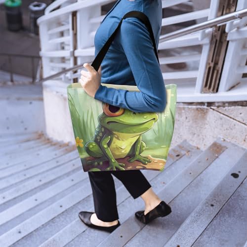 Cute Watercolor Frog Pond Large Capacity Canvas Tote Bag Stylish Handheld Shoulder Bag Reusable Shopping Bag for Work Travel Beach Trips Shopping 5