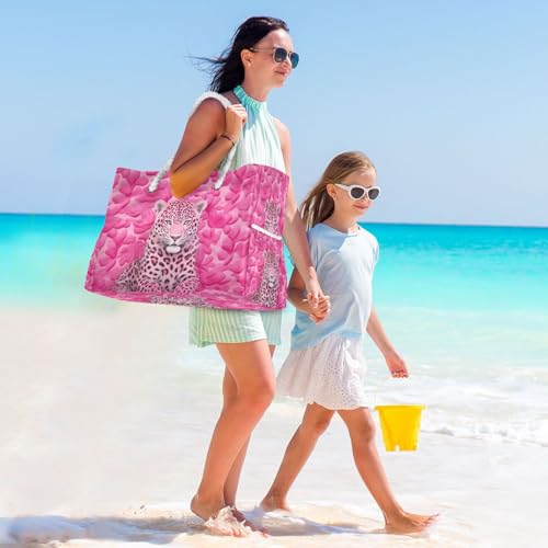 HOT ! Leopard Pink Beach Bag & Travel Tote Bag Large Sandproof with Zipper Closure, Wet Pouch for Swim Gym Travel, Lightweight Foldable Outdoor Bag