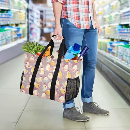HOT ! linqin Cute Chickens Flower Pink Utility Tote Bag for Women with Handles Foldable Grocery Bags Reusable Water Resistant for Laundry