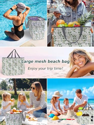 HOT ! Mesh Beach Bag Oversized Tote Bags for Women Green Leaf Watercolor Large Travel Pool Bags with 8 Pockets
